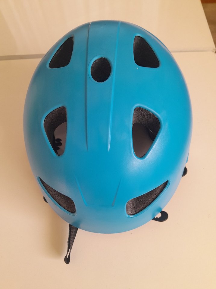 Mavi renkli, tokalı ve havalandırma delikli motosiklet kaskı. Minimalist ve desen içermeyen, renkli bir tasarıma sahip. ️