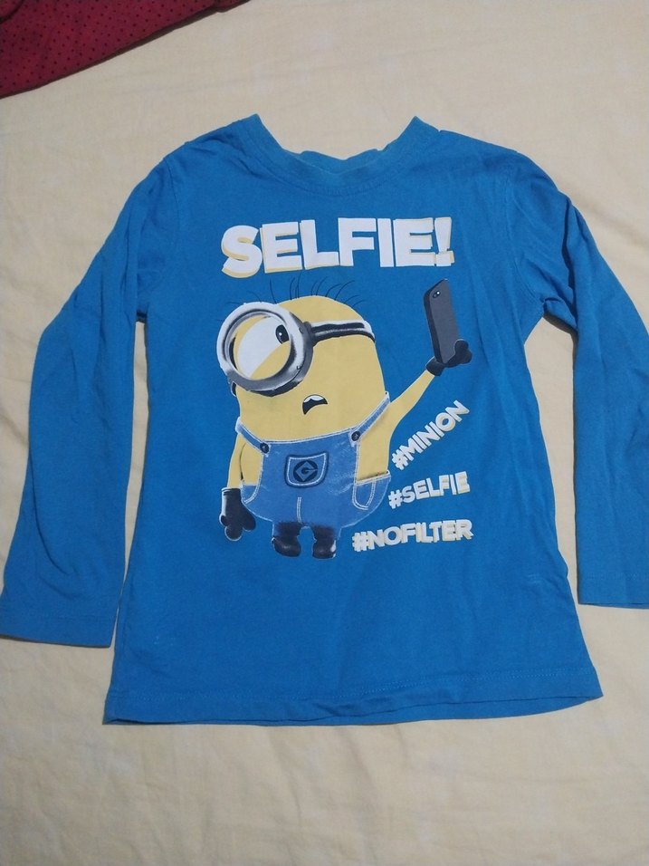 Renkli Minion baskılı, düğmeli, uzun kollu erkek tişörtü. Yumuşak ve penye kumaştan, bisiklet yakalı, selfie temalı yazılarla.