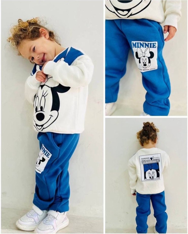 Rahat kesim, yumuşak fleece kumaştan yapılmış mavi eşofman altı, renkli Minnie baskılı. detaylı ve konforlu bisiklet yaka sweatshirt ile tamamlanmıştır.