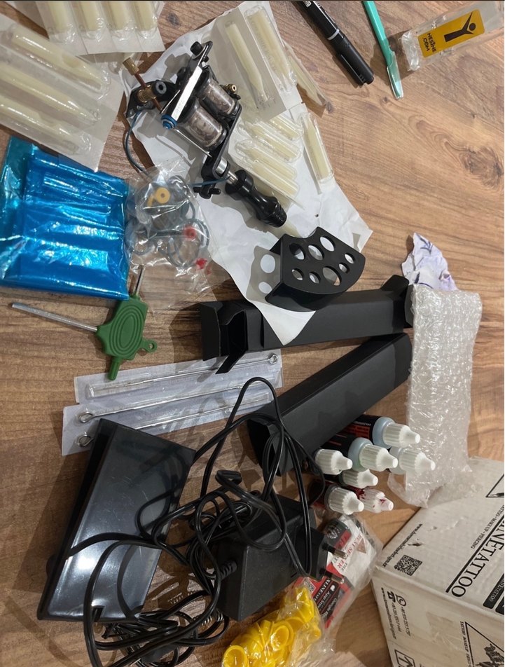 Koyu mavi renkte elektronik parçalar ve çeşitli küçük bileşenler içeren model kiti ve aksesuar seti. #dövme malzemeleri sadece denendi