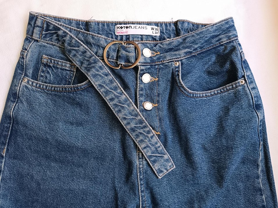 Düğmeli ve kemer detaylı, mavi renkli, denimden üretilmiş loose fit kadın jean pantolon. Vintage tarzda günlük sokak modasına uygun. Bel:28 Boy:32