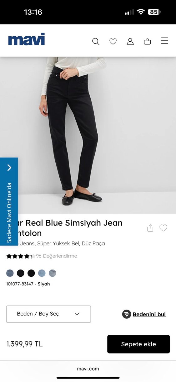 Siyah denimden yapılmış, süper yüksek bel ve düz paça kesime sahip bu kadın jean. Mavinin star modeli mankendeki ile aynı 1 kere giydim sadece 28/29 beden