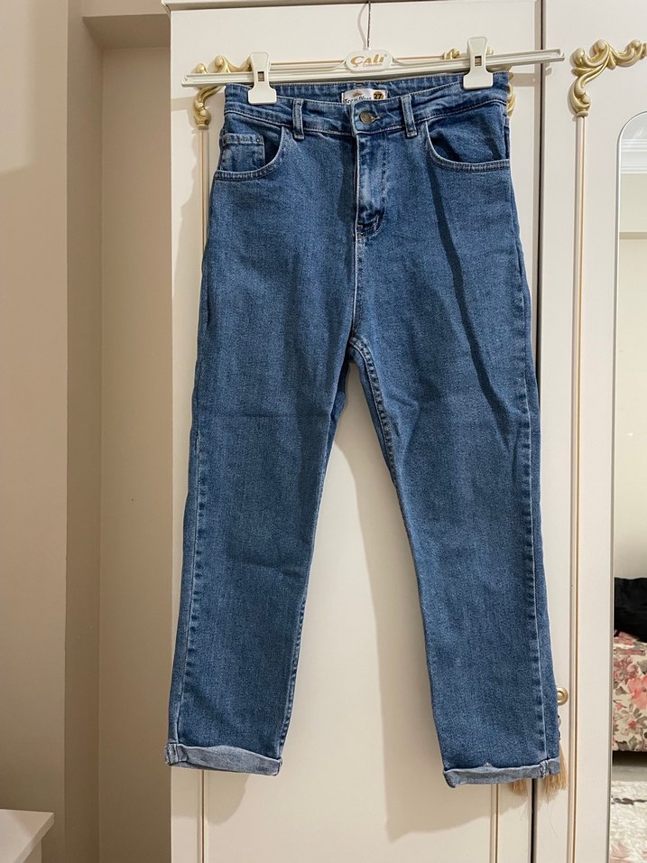 Mavi kot kumaştan mom jeans, rahat kesim ve Velcro detaylı. 34-38 beden, 55-60 kg için uygun. Yırtık veya sokuk yok. Günlük rahat kullanım için ideal.