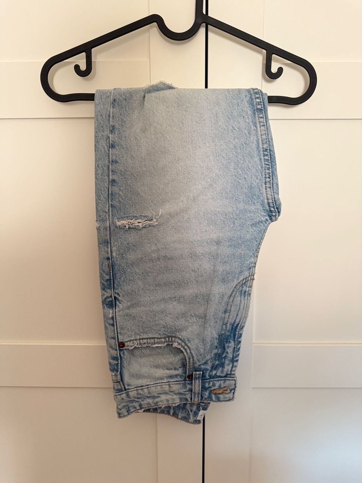 Mom kesim, mavi kadın kot pantolon. Minimalist ve sokak tarzı, günlük kullanıma uygun.