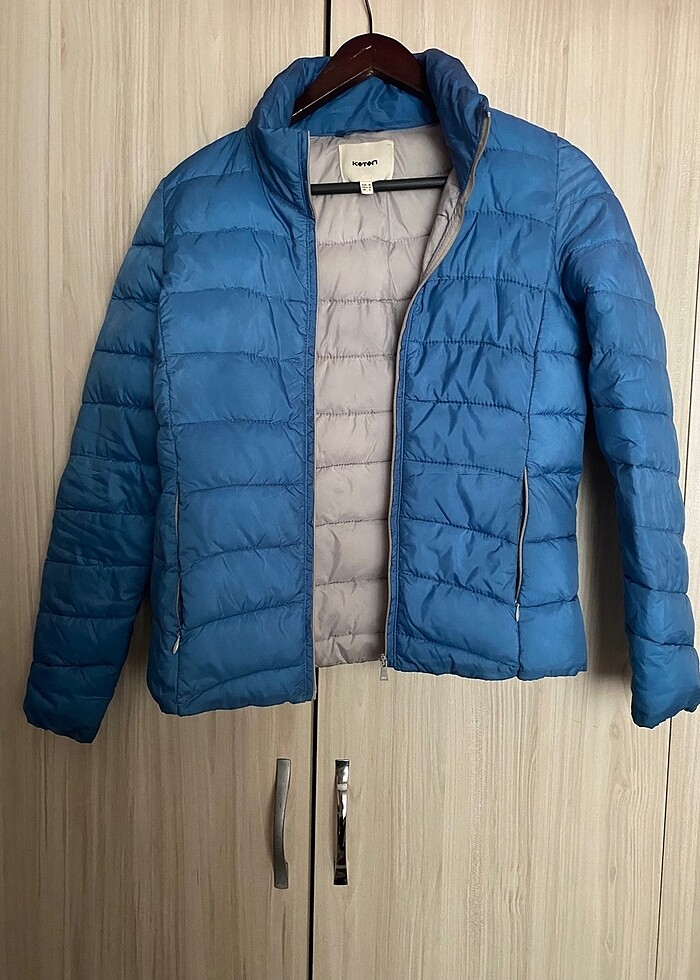 Mevsimlik mavi mont. 34 beden ama 36 bedene de uygun. Kapşonu istenirse fermuarın içinden çıkarılıp geri sokulabiliyor.