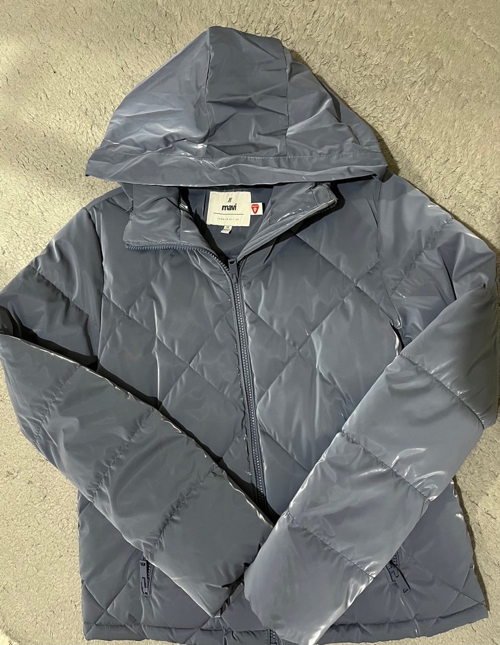Az giyildi. Boyun kısmında ince bir şapkası var.Parlak yansımalı kumaşı var.