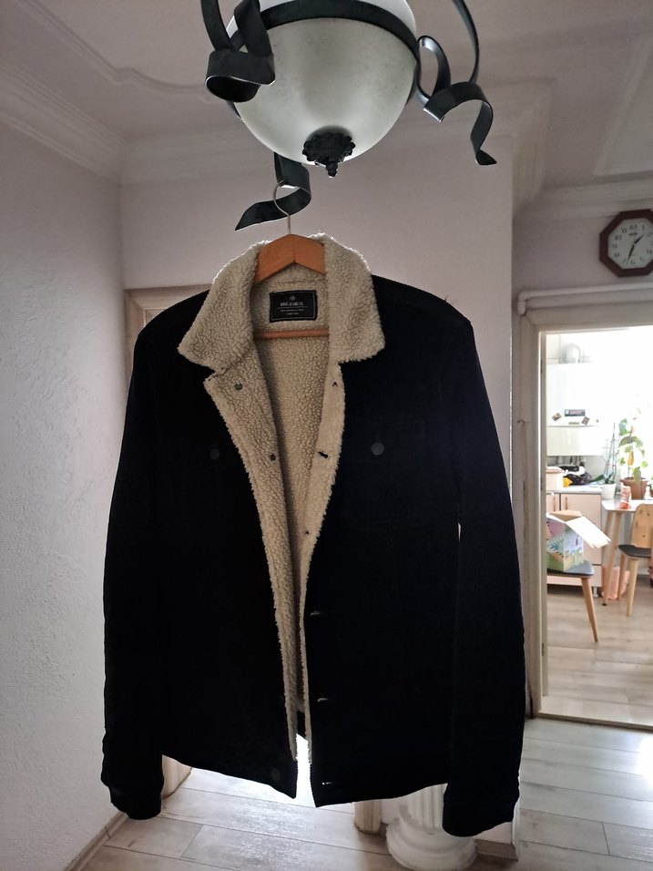 Siyah erkek süet ceket, düğmeli ve notched lapel yakaya sahiptir. Regular fit ve uzun kolludur, iç kısmı sıcak tutan kumaşla kaplıdır.