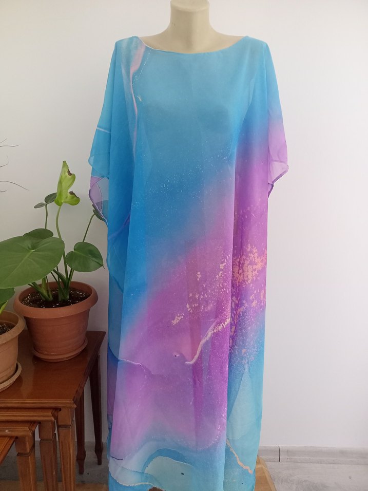 tesettür pareo haşema pareo, Mavi ve mor tonlarda pastel batik desenli, uzun ve bol kesim