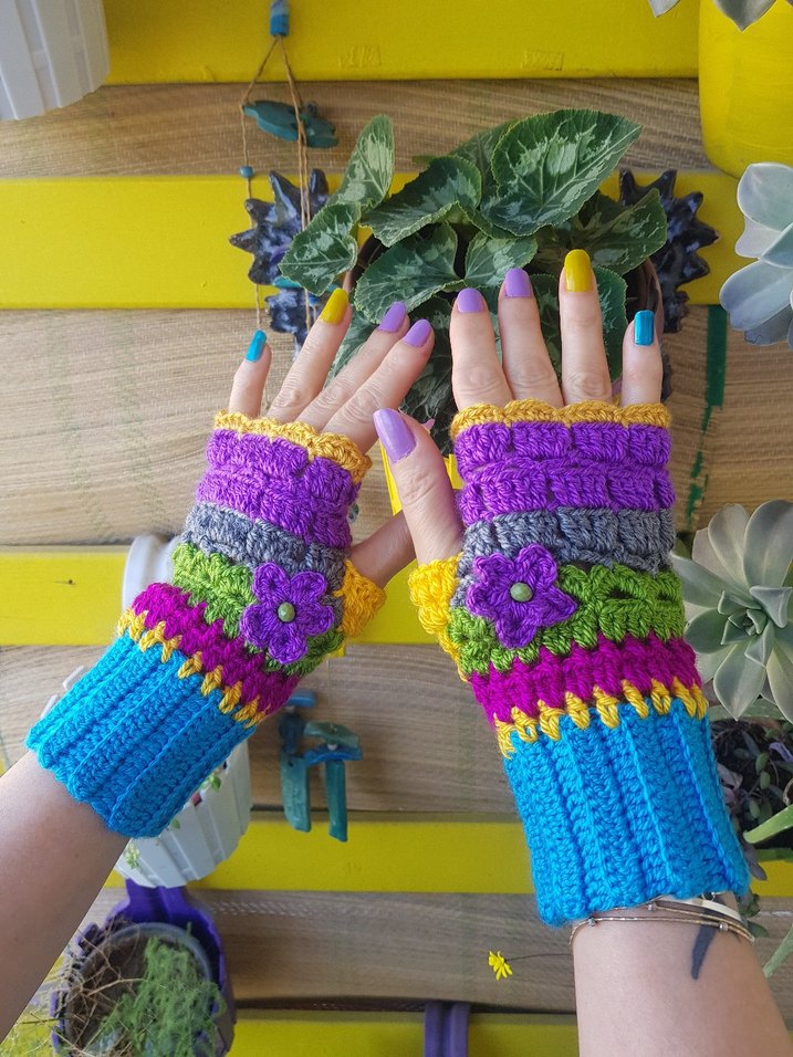 Çiçek detaylı ve canlı renkli çizgilerle örülmüş, bohem tarzda renkli parmakları açık eldivenler. Eldivenlerimizin tamamı el örgüsü ve özel tasarımdır. Rengarenk, cıvıl cıvıl, neşeli eldivenlerim, kışın içinizi ve gönlünüzü ısıtacak. Sıfır üründür. Bedeni standarttır. Eldiven çeşitlerim ve ürün yelpazem oldukça geniştir. Lütfen mağazamı ziyaret edip ürünlerimi inceleyin.