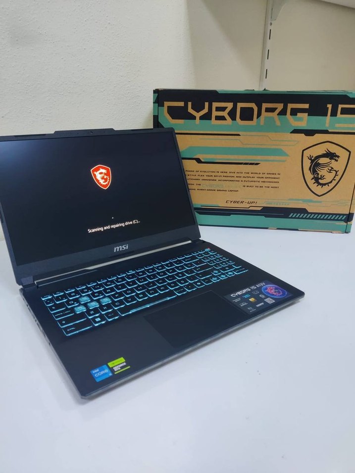 MSI Cyborg 15 dizüstü bilgisayar, mavi ışıklı klavye ve şık tasarıma sahiptir. Intel işlemci ve NVIDIA grafik kartı bulunur.