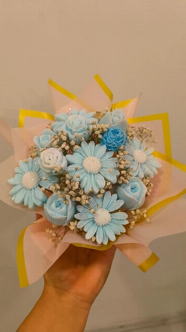 Mavi papatya ve gül şeklinde mumdan oluşan, yumuşak pembe ve sarı kağıda sarılı buket.