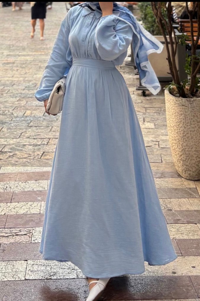 Pastel mavi renkte, müslin kumaştan uzun ve salaş kesim eteklu takım. Uzun kollu ve yüksek yakalı, drapeli detaylarıyla günlük şıklık sunar.