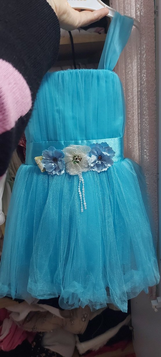 Mavi renkli, askılı ve straplez yakalı kız çocuk elbisesi. Nakışlı çiçek detayları ve fırfırlarla süslenmiştir.