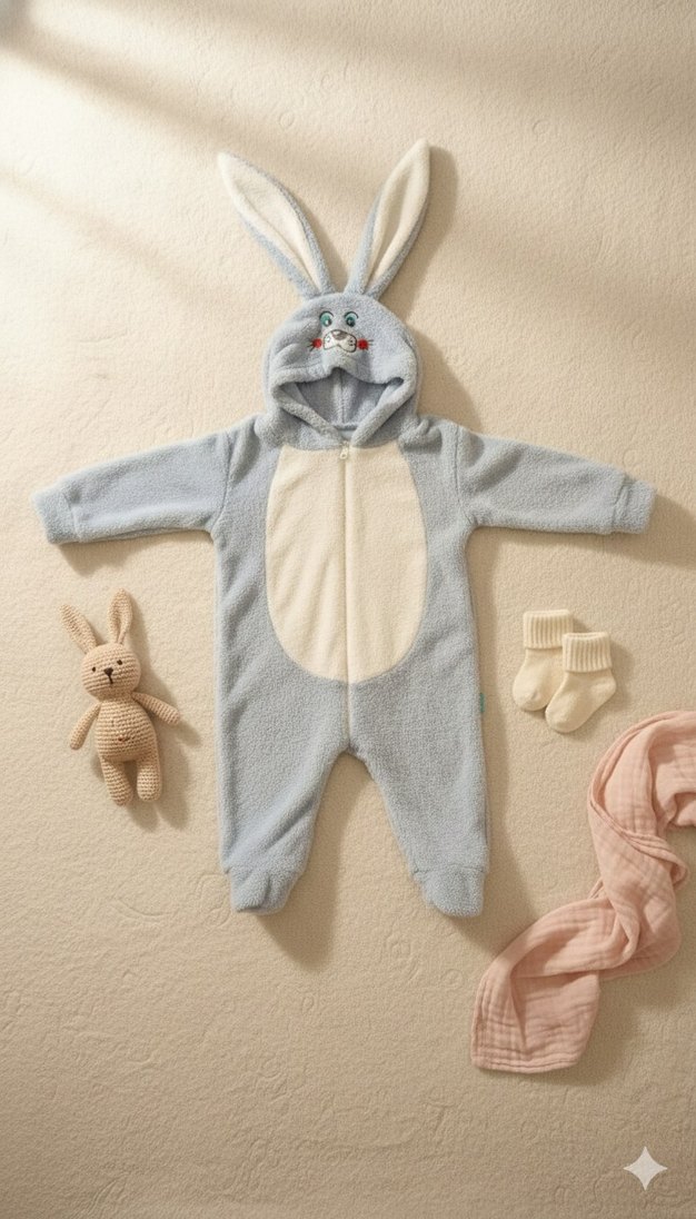 Pastel mavi renkte, nakışlı detaylara ve tavşan kulaklı kürklü kapüşona sahip yumuşak ve sıcak bebek tulumu.