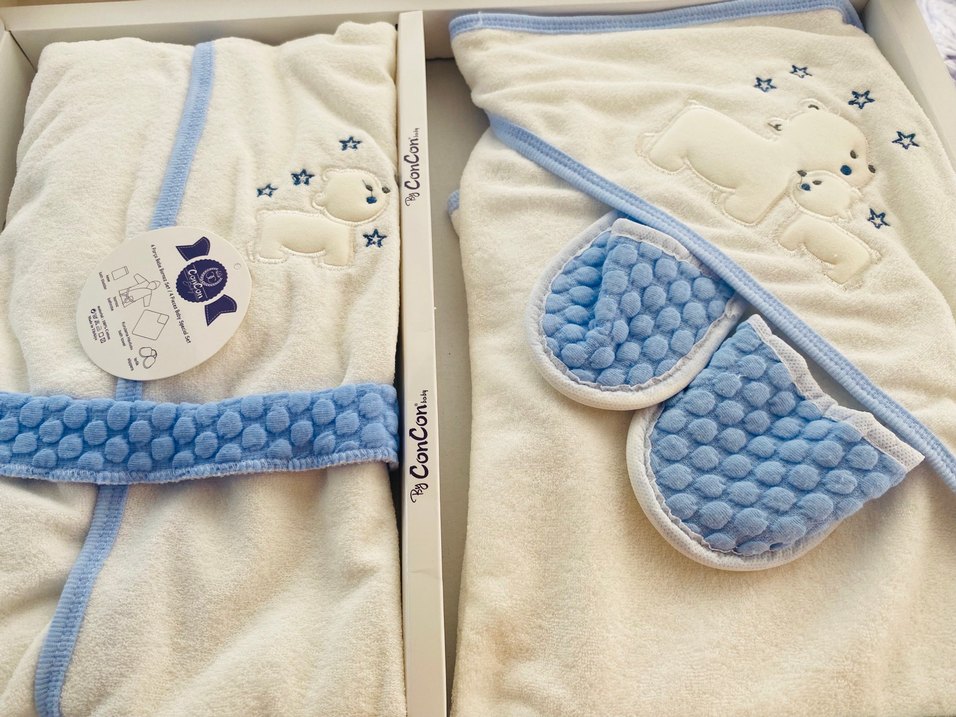 Nakışlı detaylara ve dokulu desenli mavi terliklere sahip yumuşak, pastel tonlarda bebek havlu ve bornoz seti.