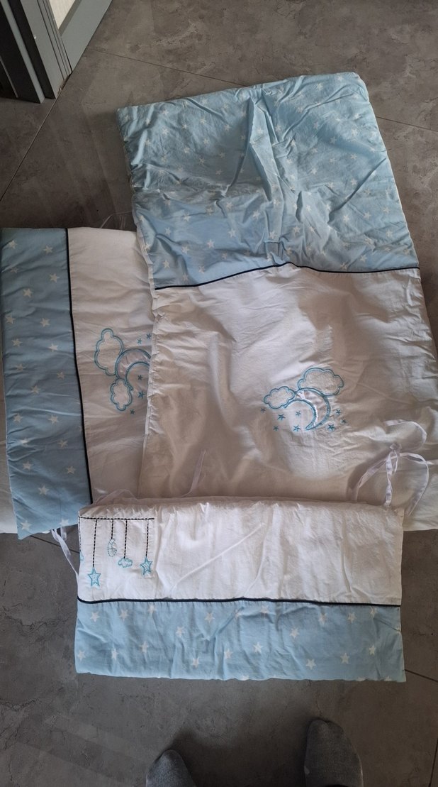 Pastel mavi sentetik kumaştan yapılmış, yıldız ve ay nakışlı bebek uyku seti, yumuşak ve rahat bir dokunuş sunar.