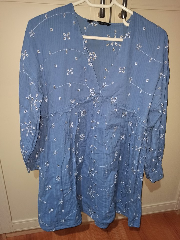 Mavi nakışlı, düğmeli, V yaka, uzun kollu, bol kesim elbise. Yumuşak keten kumaş ve bohem tarzıyla günlük kullanım için uygun.