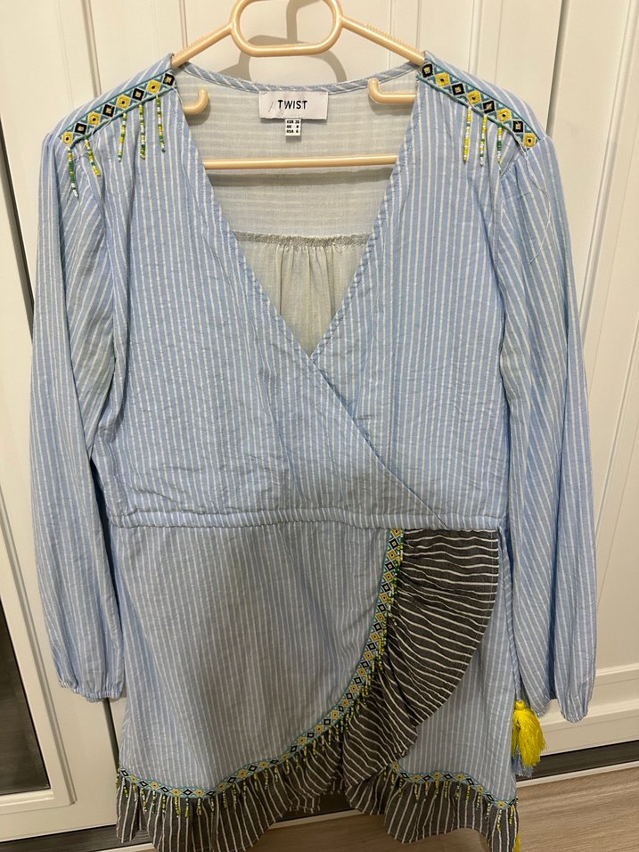 Pastel mavi renkte, uzun kollu ve V yakalı hamile bluzu. Nakışlı ve pileli detaylara sahip, bol kesim ve kısa boyda bohem tarzda bir tasarım. Yumuşak tekstil kumaştan üretilmiştir. ✨