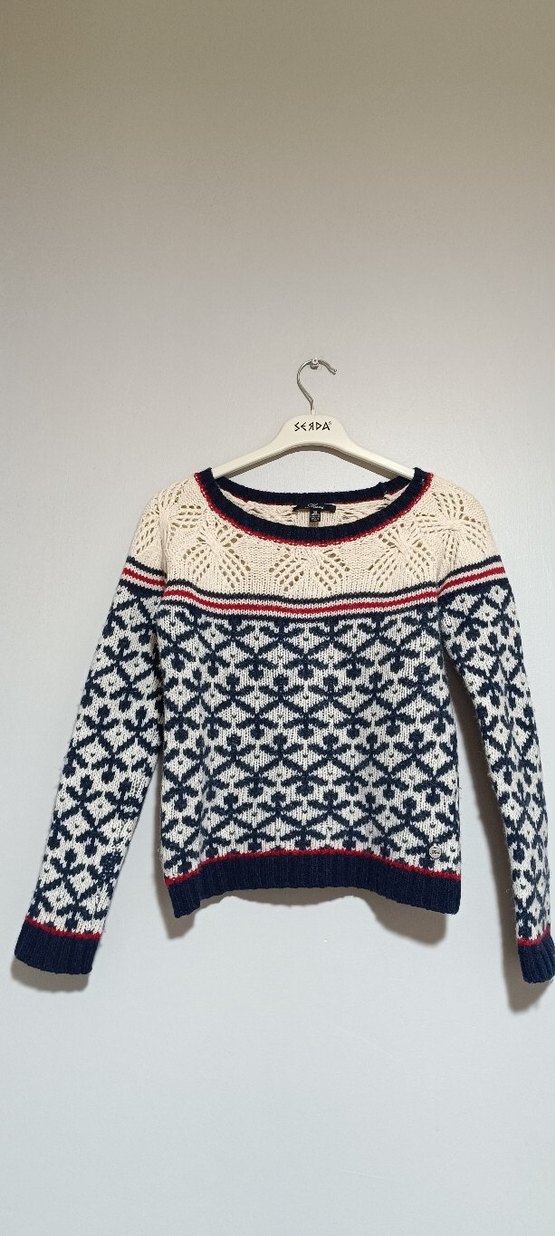 Mavi s beden nakışlı desenlere sahip, beyaz ve gri renklerde, yumuşak triko kumaştan yapılmış, bohem tarzda, uzun kollu ve yuvarlak yakalı, vücuda oturan kadın kazak.