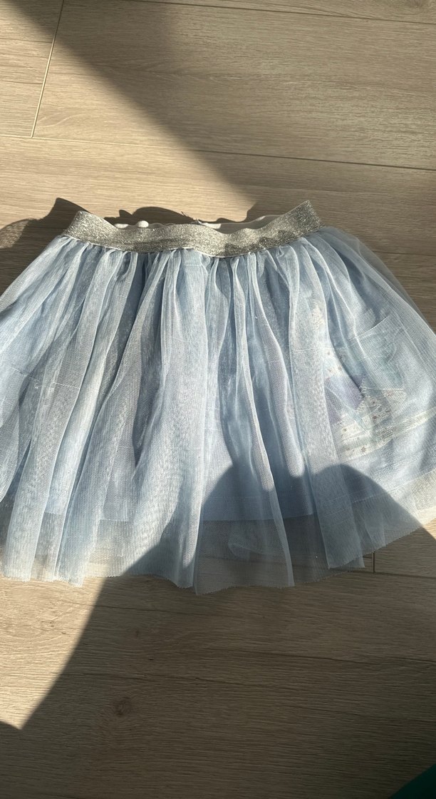 Pastel mavi renkte, nakış detaylı, bol kesim ve fırfırlı kız eteği, yumuşak sentetik kumaştan bohem tarzda.