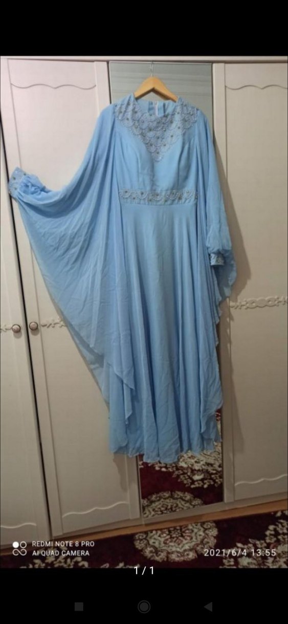 Pastel mavi, uzun boy elbise, bol kesim ve drapeli tasarıma sahip. Kolsuz, V yakalı ve nakış detaylı, mütevazı bohem stilinde düğünlere uygun.