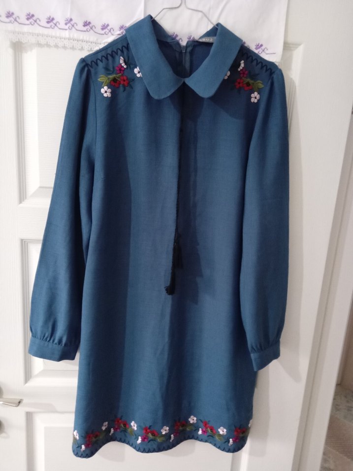 Uzun kollu, yakalı ve düğmeli mavi tekstil tunik, omuz ve etek kısmında nakışlı çiçek detaylarına sahip. Bol kesim, bohem tarzda.