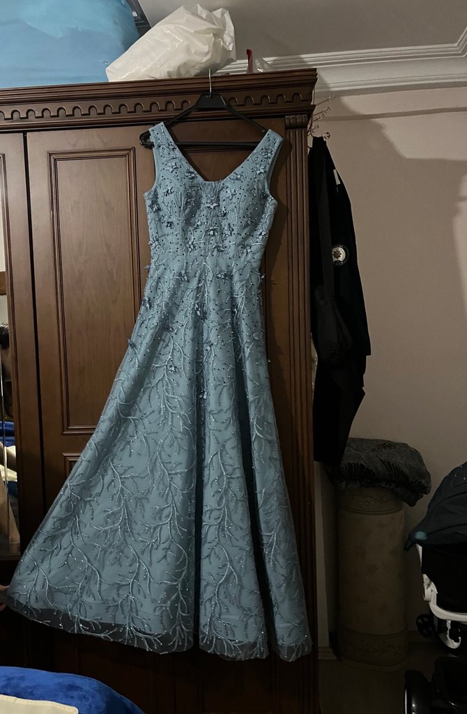 V yaka ve kolsuz tasarıma sahip, nakışlı dantelli mavi uzun abiye elbise, düğünler için modern klasik bir görünüm sunar. Hiç giyilmedi. 160-165 boy için 7-8 cm topuklu ile giyilebilir. 60-65 kilo için uygundur. Göğüs dekoltesinde tadilat vardır görselde de görüldüğü üzere isteğe bağlı çıkartılabilir.