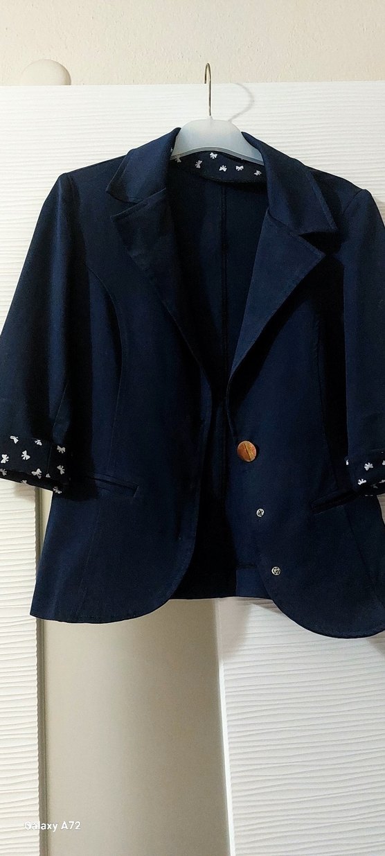 Mavi denim kumaştan, yakalı ve düğmeli kadın blazer. sakatı kollu ve nakışlı detaylara sahip, ofis için uygun. ✨