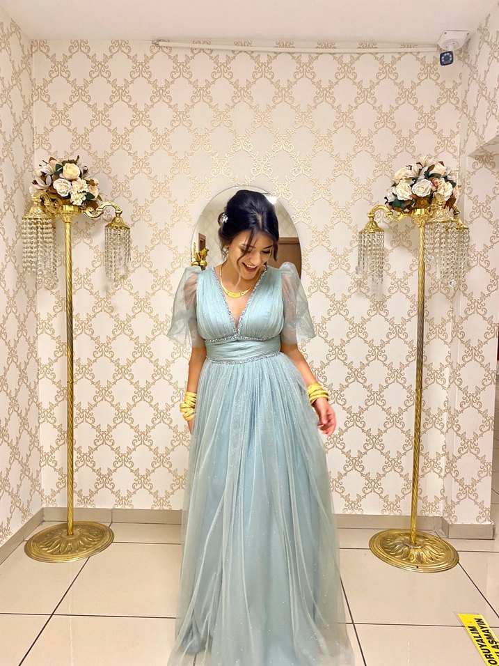Pastel mavi renkte, nakış detaylı, drapeli ve v yaka uzun abiye elbise. Kısa kollu ve klasik zarafetle bohem stilin birleştiği tasarım.