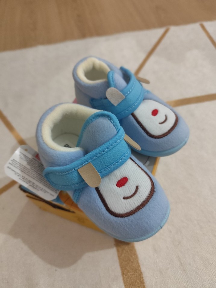 Yumuşak kürklü, renkli nakışlı desenli mavi erkek bebek ilk adım ayakkabısı. Kolay kullanım için cırt cırtlı bant bulunur, şık sokak stili için uygundur.