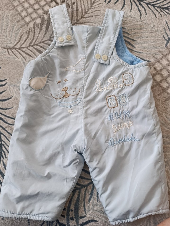Pastel mavi renkte, yumuşak fleece kumaştan yapılmış erkek bebek kayak tulumu. Nakışlı detaylar ve düğmeli askılar bulunur. Sokak stiline uygun.