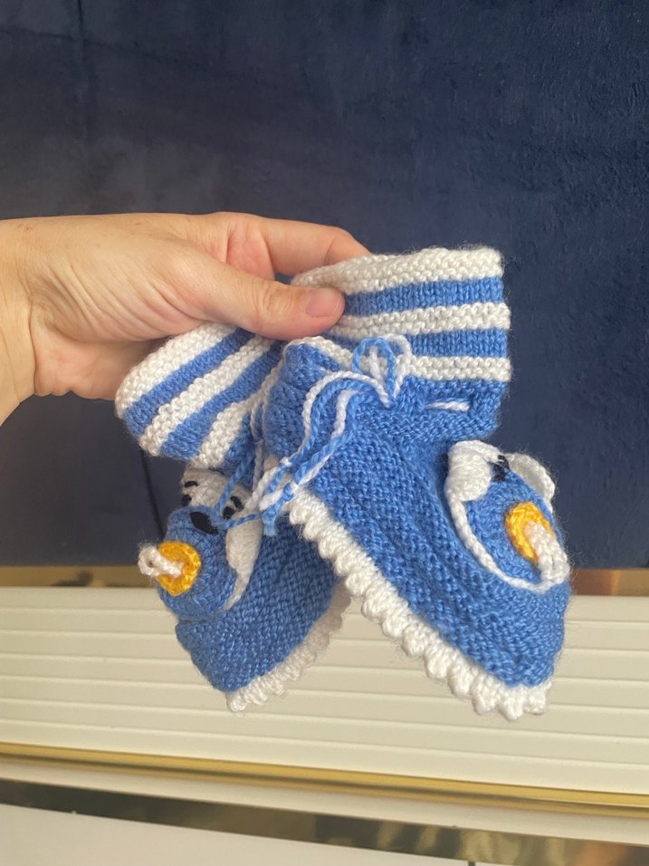 Mavi renkli, nakışlı detaylara sahip örgü erkek bebek patikleri, renkli çizgili manşetiyle yumuşak ve rahat bir kullanım sunar.