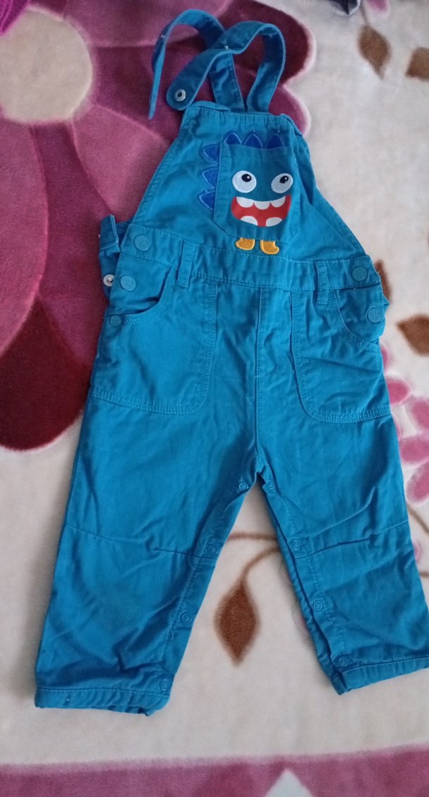 Mavi, nakışlı canavar desenli, düğmeli, yumuşak ve sıcak dokulu erkek bebek için fitted kesim kolsuz salopet.