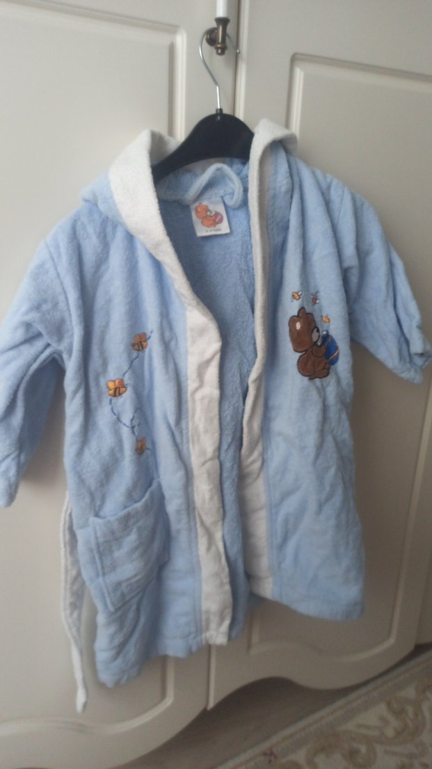 Pastel mavi renkte, yumuşak kumaşlı erkek çocuk bornozu, ayı ve kelebek nakışları ile süslenmiştir. Kapüşonlu ve ön ceplidir.