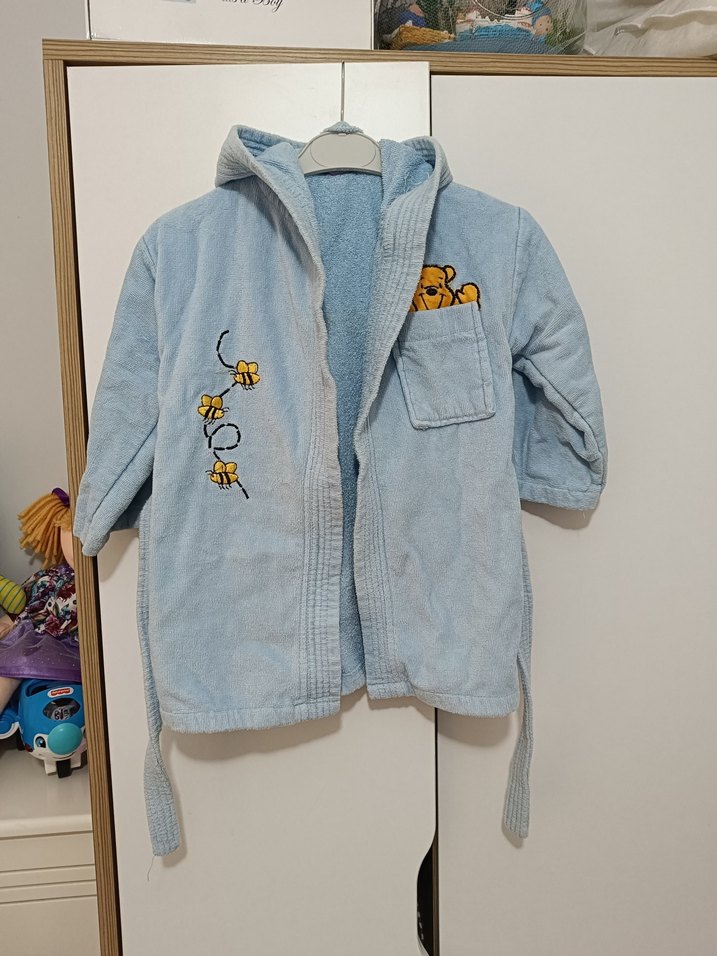 Pastel mavi renkte erkek çocuk bornozu, nakışlı arılar ve cepte küçük bir ayı detayıyla yumuşak dokulu ve kapüşonludur.