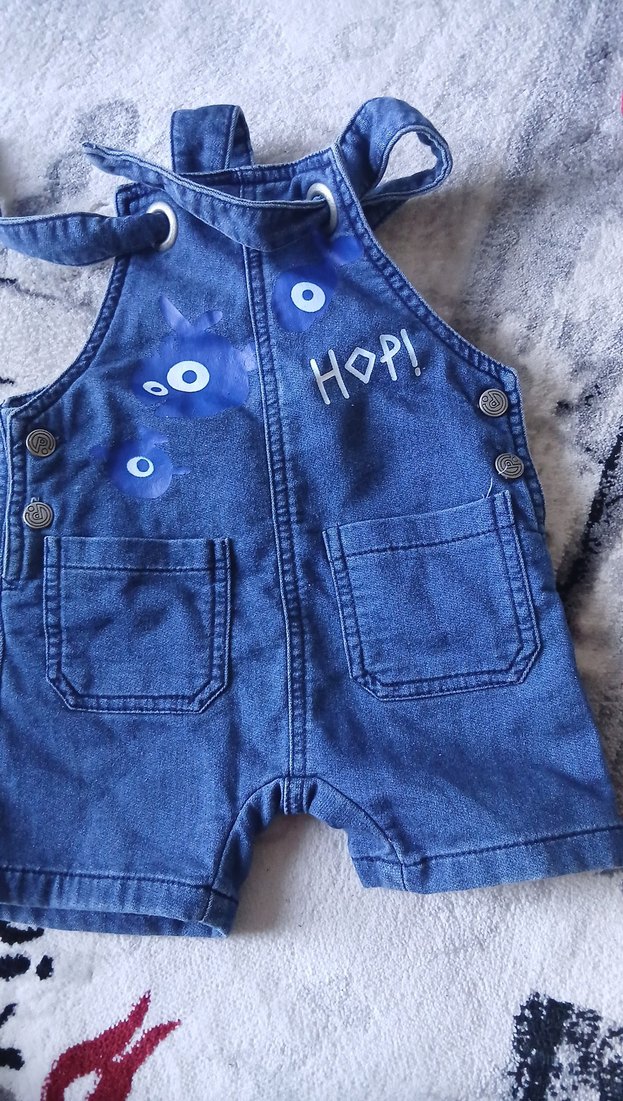 Düğmeli, nakışlı "HOP!" yazılı, cepli, mavi kot kumaştan erkek çocuk tulumu. Salaş kesim ve kolsuz tasarımla sokak stili için uygun.