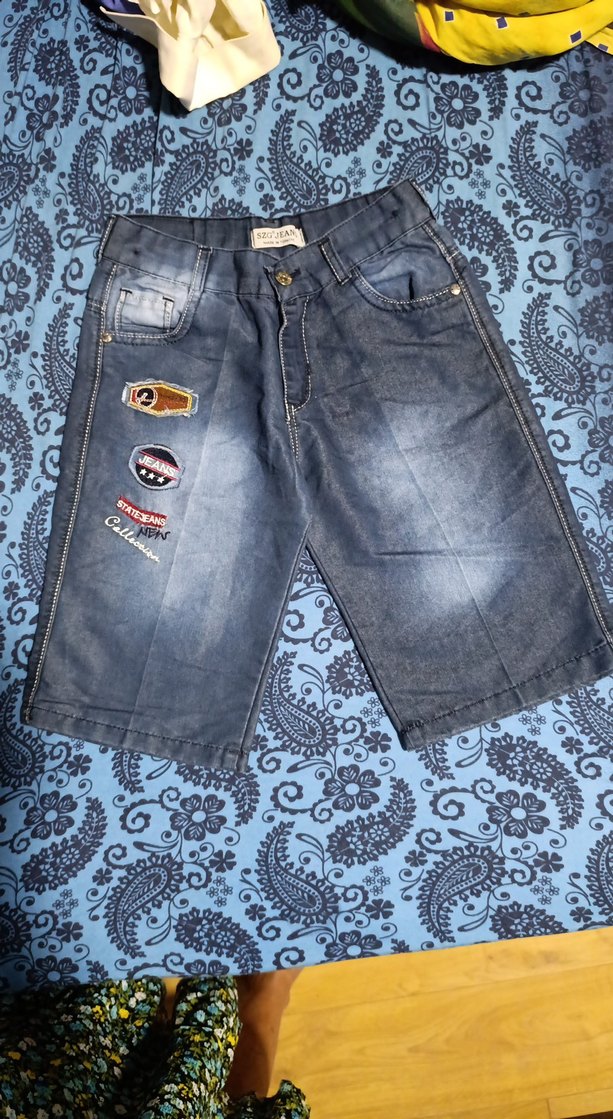 Mavi ot kumaştan yapılmış, bol kesim ve düğmeli erkek şortu. Nakışlı patch detaylarıyla sokak tarzını yansıtıyor.