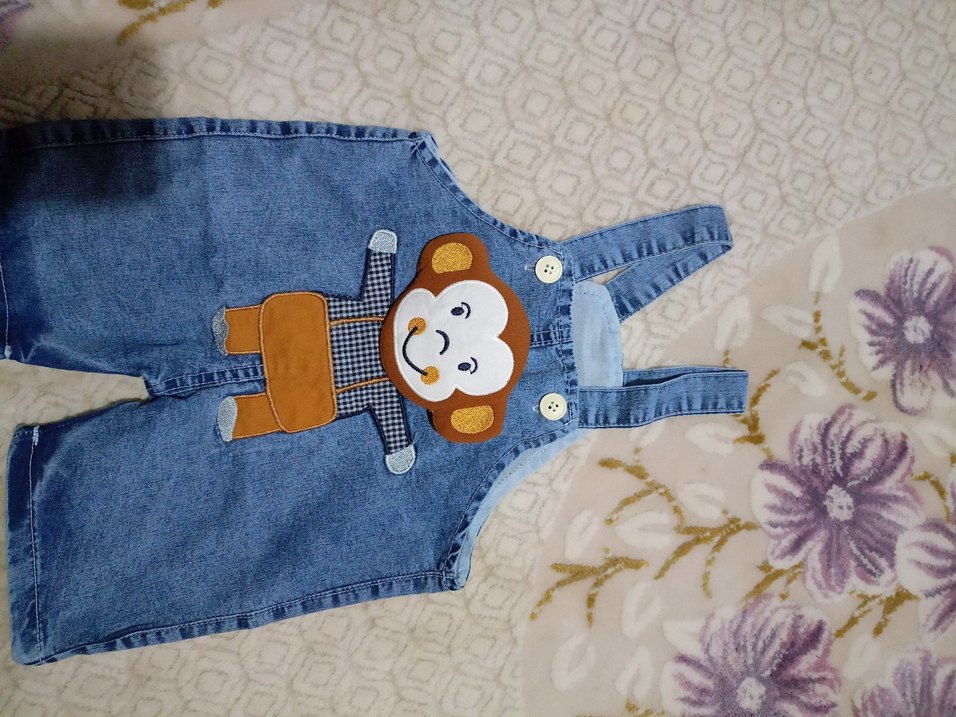 Renkli nakışlı maymun desenli, düğmeli askılı, mavi kot kumaştan erkek tulumu. Normcore tarzında, vücuda oturan kesim.