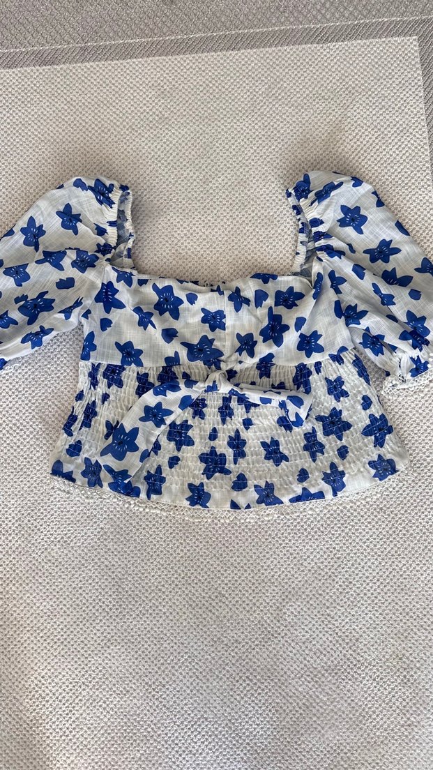 Mavi nakışlı çiçek desenleri, tekne yaka, fırfırlı detaylar ve kısa askılı kollarla hazırlanmış vücuda oturan kadın bluz. Bohem tarz için uygun.