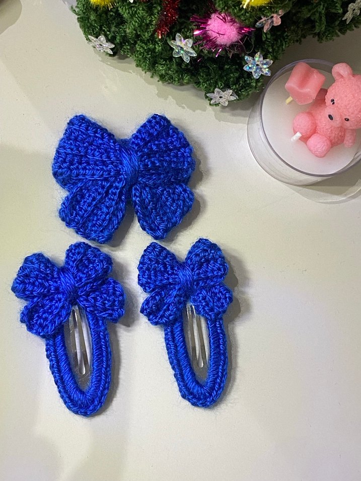 Nakışlı fiyonk detaylı, renkli ve bohem tarzda mavi çocuk saç tokası seti, üç parçadan oluşur.