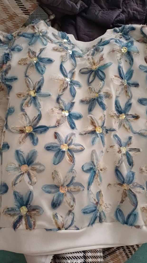 Nakışlı çiçek desenli, mavi Kayık yaka, askılı kol ve fırfır detaylı, bol kesim ve uzun boyda, tesettür takım.ben 168 boy 75 kiloda 2 defa giydim.hiçbir deformesi yoktur.