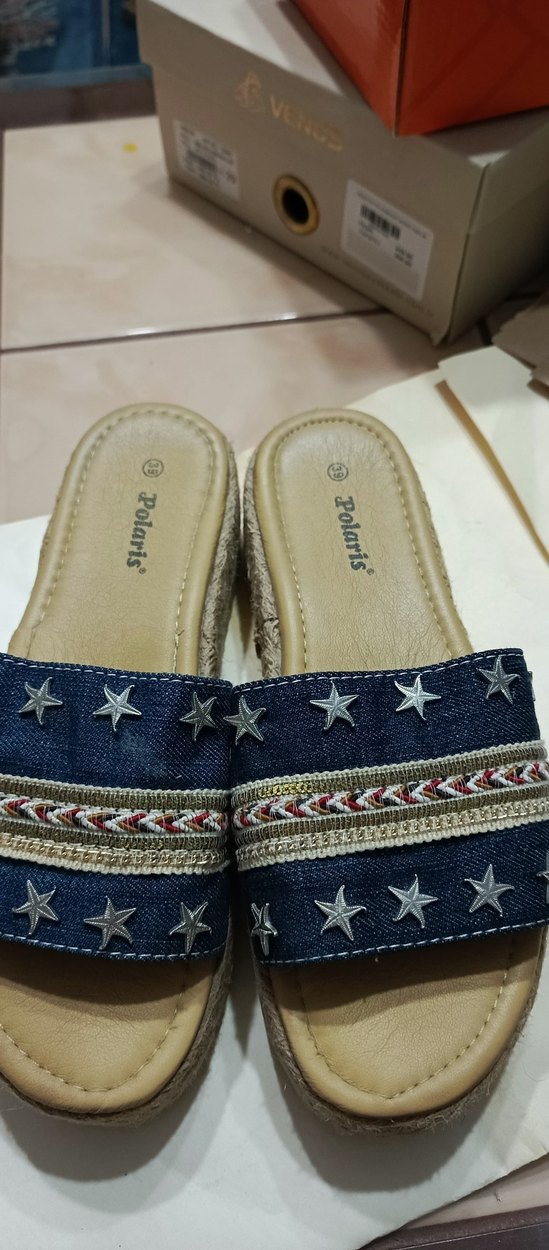 Nakışlı desenli, cırt cırtlı, mavi parlak denim malzemeden kadın dolgu topuklu espadril. Bohem tarzını yansıtır, günlük kullanım için uygundur. yanlarında açılma var .