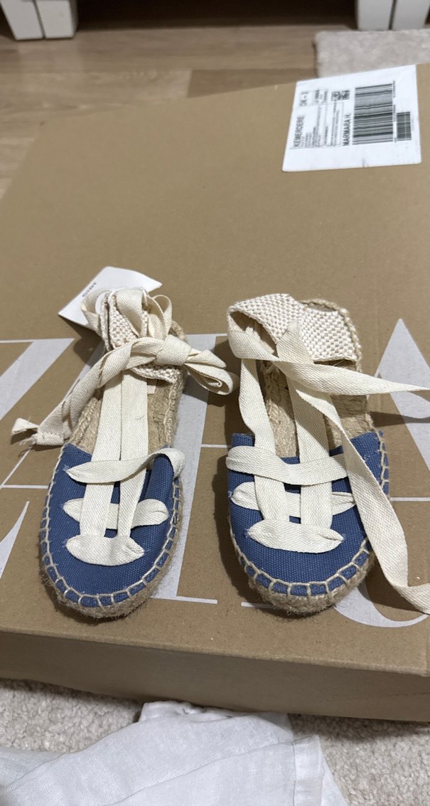 Mavi nakışlı espadril, dolgu topuklu ve bağcıklı tasarıma sahiptir. Kauçuk tabanlı, günlük kullanıma uygun bohem tarzda bir ayakkabıdır.