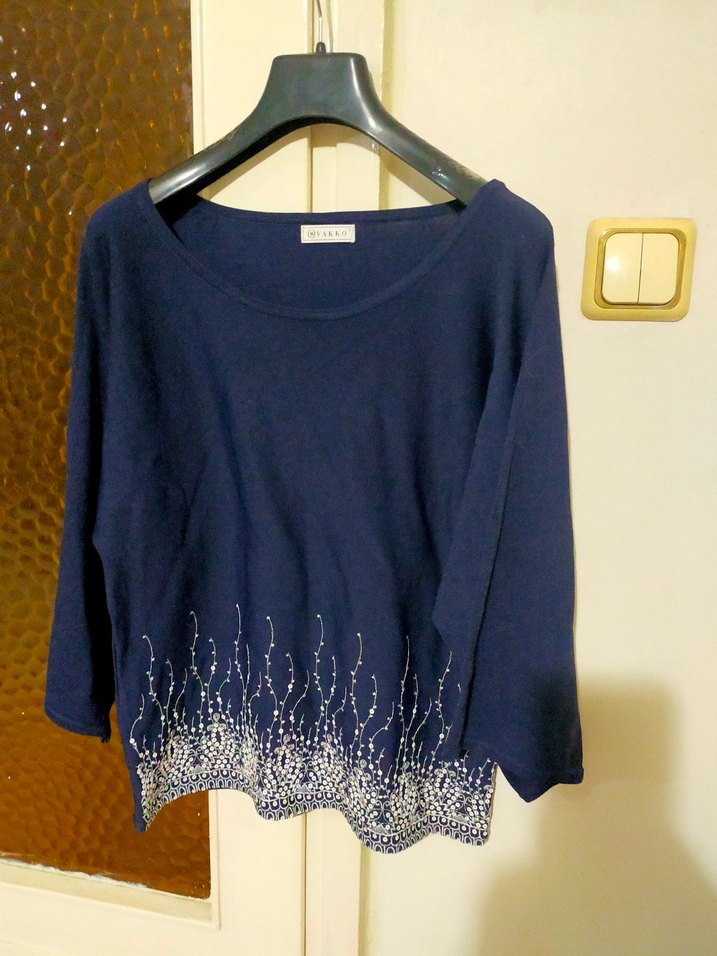 Mavi renkli, pamuklu, uzun kollu ve yuvarlak yakalı triko kazak. Alt kısmında nakış detayları bulunan, rahat kesimli günlük kullanıma uygun bir parça. Vakko
