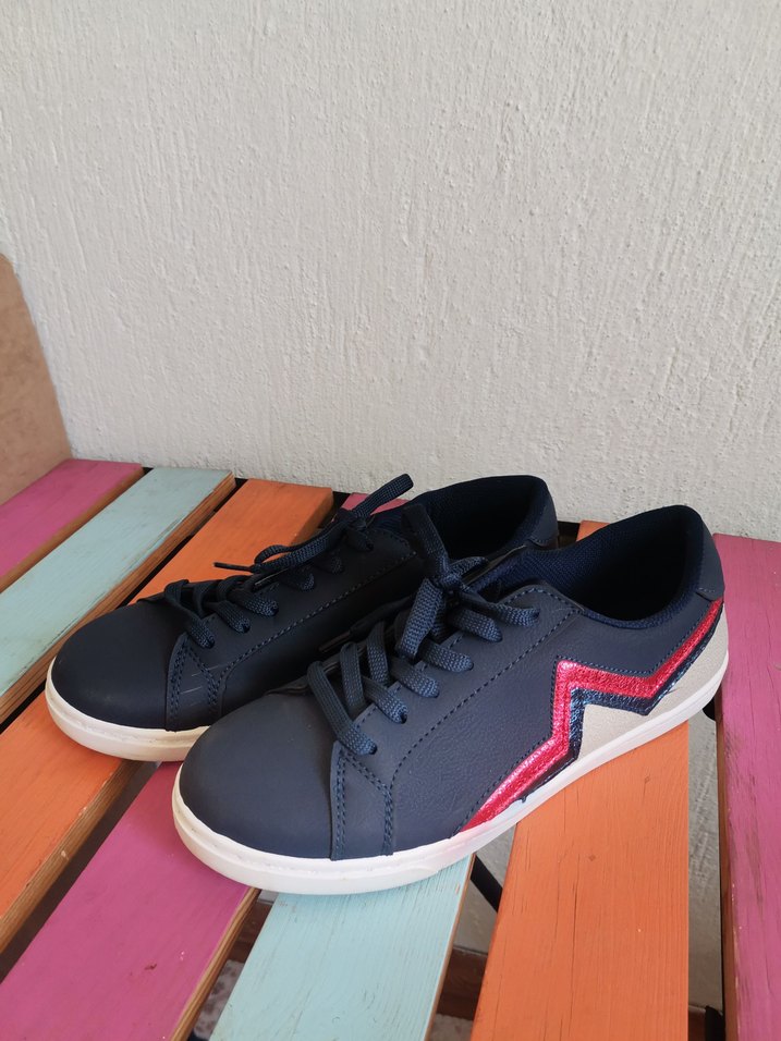 Mavi renkte, nakışlı desenlere sahip kadın sneakers. Kauçuk tabanlı, velcro ve stilettolu topuk detaylarıyla spor ve sokak tarzına uygun. Hiç giyilmedi yenidir
