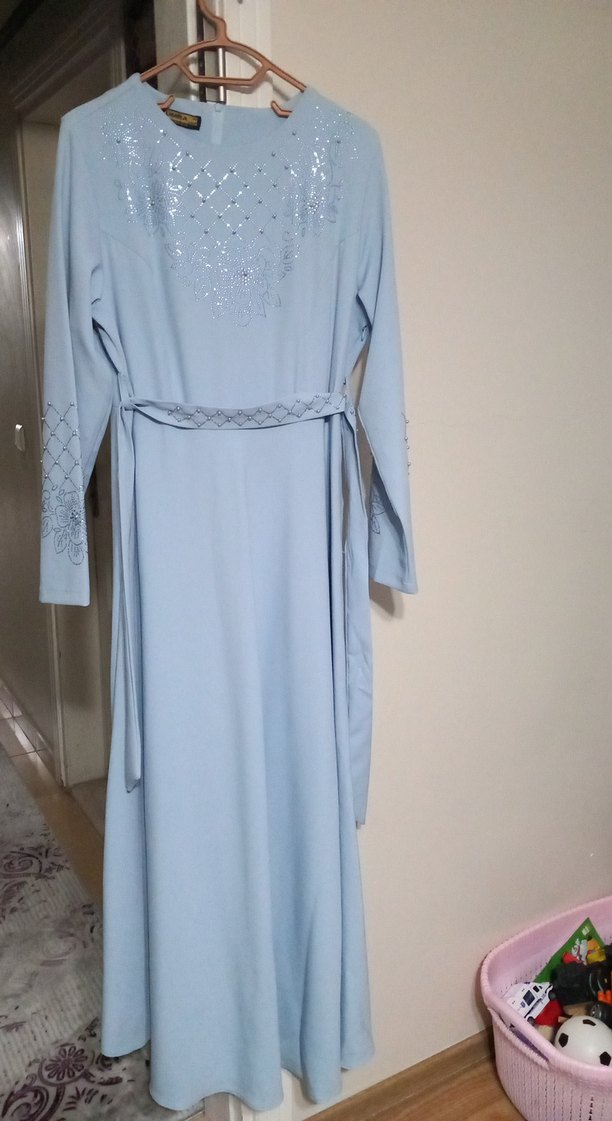 Mavi renkte, uzun kollu ve nakış detaylı, minimalist tarzda, kemerli uzun kadın elbisesi.