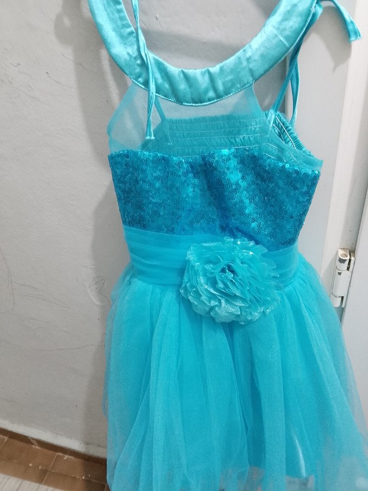 Mavi renkli, nakış işlemeli straplez kız çocuk elbisesi, ince oturan kesimi ve fırfır detaylarıyla dikkat çeker. Kolsuz ve bohem tarzda, belinde çiçek süsü bulunur.