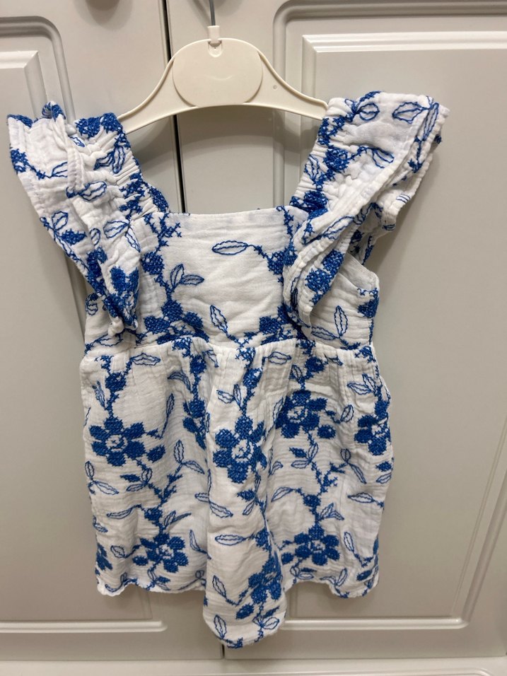 Mavi çiçek nakışlı, fırfırlı, kolsuz kız elbisesi. Straplez yaka ve bol kesim bohem tarzda. Yumuşak tekstil kumaştan yapılmıştır.