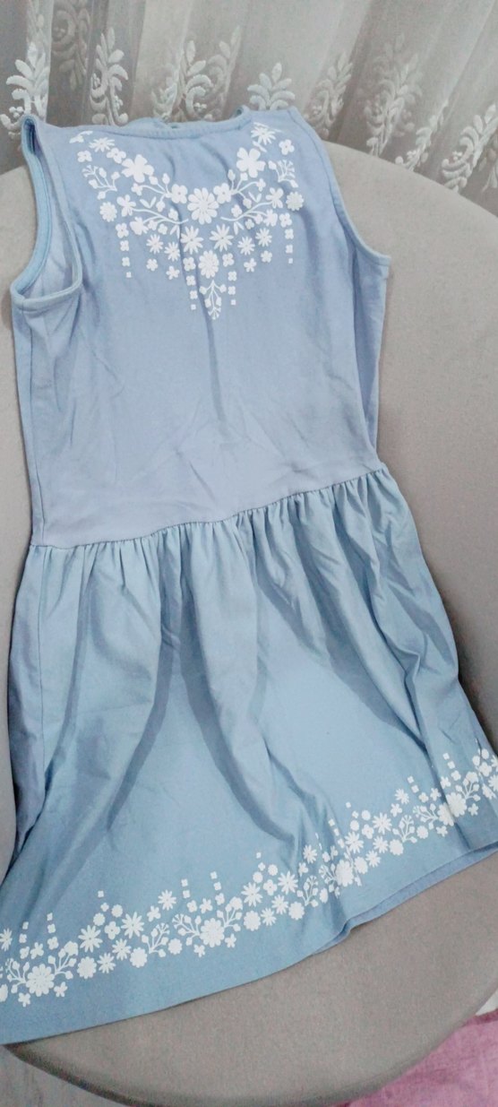 Kolsuz, mavi kız elbisesi, bol kesim, fırfırlı detaylı ve göğüs ile etek kısmında beyaz çiçek nakışlıdır. V yaka ve yumuşak sentetik kumaştan üretilmiştir.