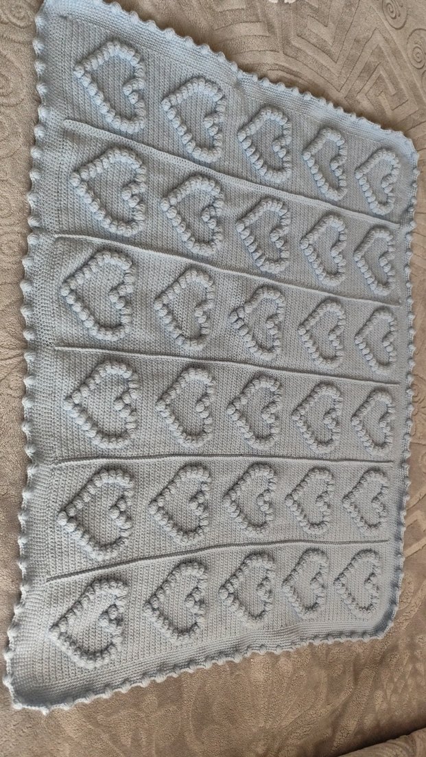mavi renkte, nakışlı kalp desenli, yumuşak dokulu örgü bebek battaniyesidir.
